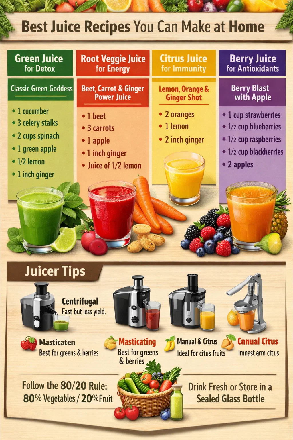 أفضل مختلفة عصير وصفات تجمع بين الخضار و الفواكه بشكل تقريبي نسبة الخضار 80% إلى الفاكهة 20% مما يمنحك أقصى قدر من العناصر الغذائية دون زيادة السكر. سواء كنت تستخدم عصارة تعمل بالطرد المركزي أو عصارة مضغ بالضغط البارد، فإن الفئات الأساسية هي نفسها: العصائر الخضراء، ومزيج الخضروات الجذرية، ومزيج الحمضيات، والمشروبات القائمة على التوت، والتركيبات الاستوائية. تخدم كل فئة غرضًا غذائيًا مختلفًا، وبمجرد فهمك للنمط، يصبح إنشاء وصفاتك الخاصة من الصفر أمرًا سهلاً. تتناول الأقسام أدناه كل نوع رئيسي، مع كميات المكونات الدقيقة والبيانات الصحية والنصائح العملية التي تعمل بغض النظر عن العصارة التي تمتلكها.