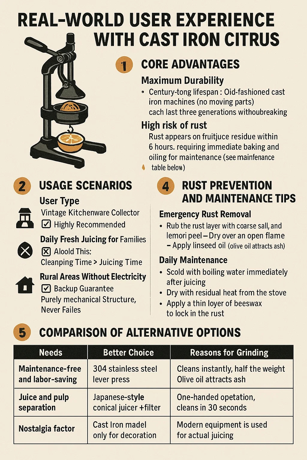 عمر افتراضي يصل إلى قرن من الزمان: يمكن لآلات الحديد الزهر القديمة (بدون أجزاء متحركة) أن تدوم لثلاثة أجيال دون أن تتعطل؛ قوتها في عصر العصير تفوق الفولاذ المقاوم للصدأ الحديث.