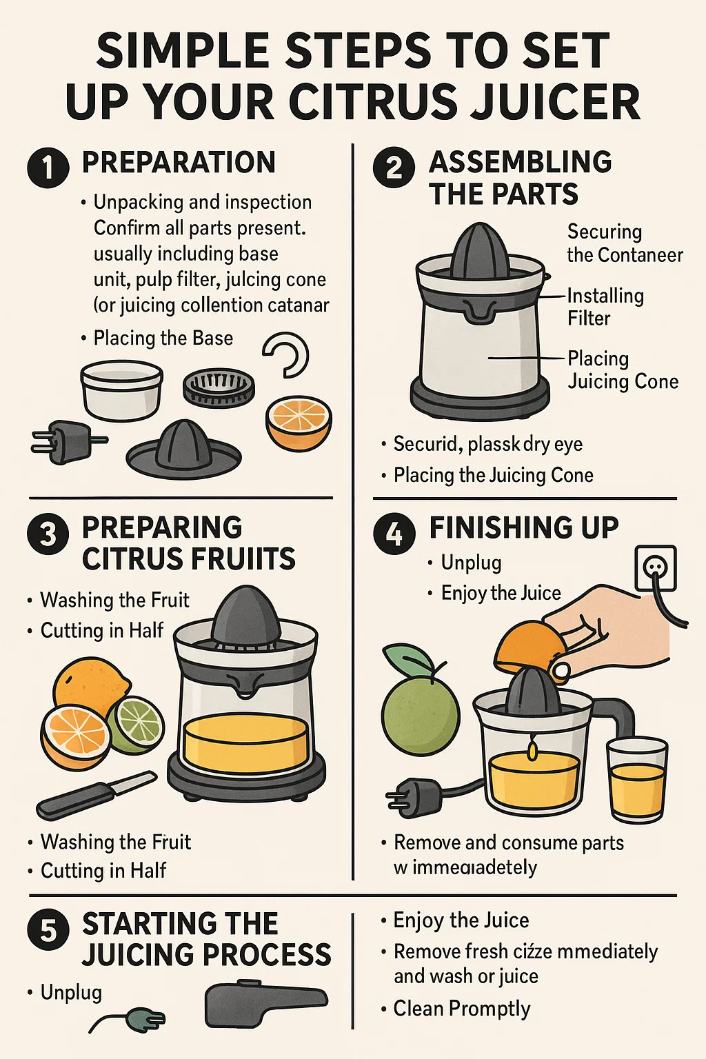 التفريغ والفحص: أولاً، أخرج عصارة الحمضيات من العلبة. تأكد من وجود جميع الأجزاء، بما في ذلك عادةً الوحدة الأساسية، وفلتر اللب، ومخروط العصير (أو رأس العصير)، ووعاء جمع العصير.